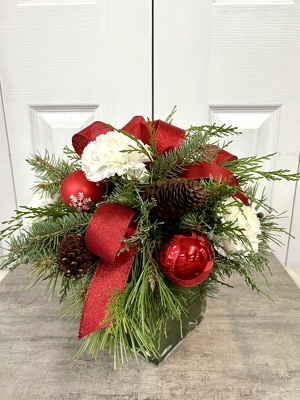 Make the Christmas season merry and bright with this arrangement of pine cones, white carnations, and evergreens accented by red ornaments and bows.