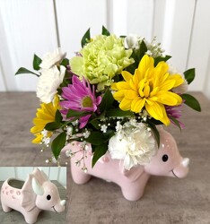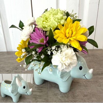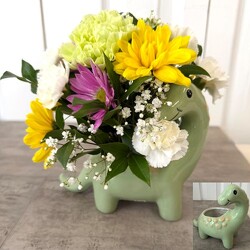 A playful dinosaur keepsake filled with bright daisies, soft carnations, and delicate baby's breath and greens. This cheerful arrangement is sure to deliver a dino-sized smile. You can pick from the green, pink or blue.
