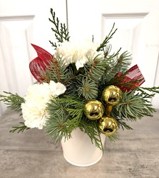 Bring the joy of the season home with Holiday Cheer! This festive arrangement features fragrant evergreens, white carnations, gold ornaments, and red ribbon. Can choose from a green, white, or red container.