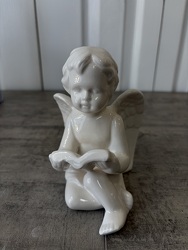 Charming ceramic angel figurine in a glossy white finish, featuring a peaceful resting pose with delicate wings and soft detailing. Choose from one of three unique styles available, each with a different pose for a cohesive yet varied display. Its gentle, serene expression brings a sense of comfort, remembrance, and quiet reflection to any space. Between 4.5 to 6.5 inches tall.