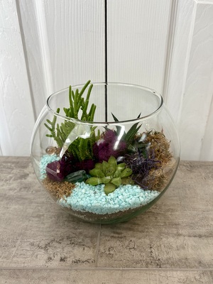 A tasteful terrarium is the perfect gift for any occasion. Our beginner's terrarium has 3 succulents that require little water planted in a recycled glass bowl (about 7" tall and 8" wide).