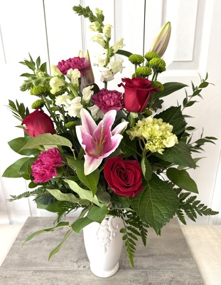 A fresh and beautiful mix of roses, lilies, carnations, snapdragons, button mums, hydrangea, and lush greenery arranged in a classic white vase.